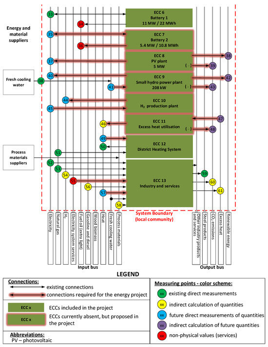 Energy, material, and service flows are systematised in the ECC framework. Input flows enter through measurement points—covering primary energy sources, materials, and services—while outputs are linked to end users or emission sinks. The boundary of the proposed project is delineated with a red dashed line. Each crossing is equipped with a measurement point, detailed in Table 2, which indicates the type and source of data, including physical meters (green), calculated points (yellow), planned meters (blue), projected indirect values (purple), and non-physical service indicators (red).
