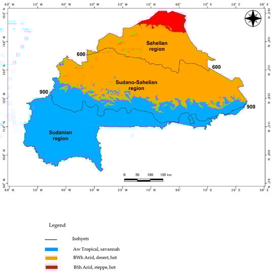 Climate zones according to the Köppen–Geiger classification and isohyets (mm/year) in Burkina Faso [20].