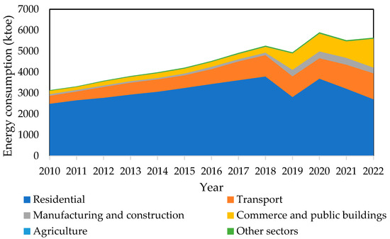 Among the various sectors, the residential sector is the biggest consumer of final energy [12]. However, for the period 2010 to 2022, the residential sector fell from 79% to around 47% of total annual consumption [12]. This decline could be explained by the development of other sectors of activity, particularly trade and transport. The non-residential sector, comprising commercial and public buildings, rose from 5% to 24.40% of final energy consumption between 2010 and 2022. In short, the residential and non-residential building sector is the largest energy-consuming sector in Burkina Faso, as shown in Figure 6. This finding aligns with other countries in the sub-region [36]. It should be emphasized that energy consumption is the sum of all energy sources. If we reduce energy consumption to that of electricity alone, we see that the industrial sector is the leading consumer, followed by the residential sector, commerce, and public buildings [12]. This reason is explained by the low electricity access rate among the population, which was less than 25.25% in 2022.