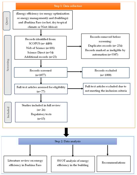 This study began by collecting key documents relating to energy efficiency in Burkina Faso. The study follows a structured methodology to identify, analyze, and synthesize the relevant literature related to the topic. Figure 8 explains the methodological approach used.