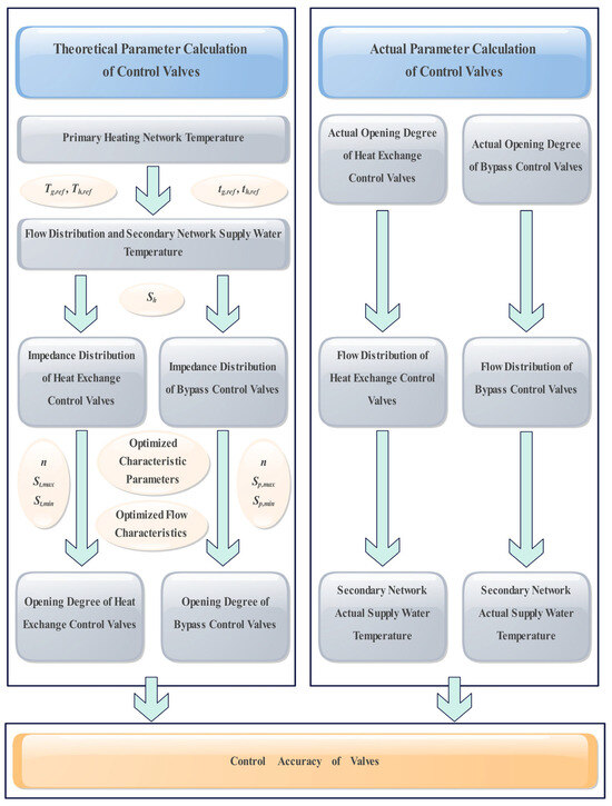 In practical applications, the valves have a dead zone, causing the actual opening degree to fluctuate near the set value. This directly affects the flow distribution and the secondary network’s supply water temperature. Therefore, the actual parameter calculation, based on the theoretical parameters, takes into account the influence of the dead zone. Through Formulas (13) and (14), the flow distribution is recalibrated, and through Formula (15), the actual supply water temperature of the secondary network is calculated. This process is closer to the real operating environment and can reflect the dynamic balance state of the actual network.