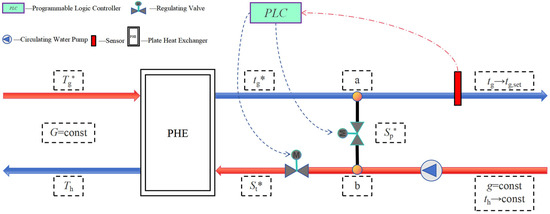 When circulation pumps operate at a fixed frequency, the equivalent impedance between points a and b remains constant, ensuring a stable secondary network circulation flow rate. During pump frequency adjustments, thermal substations dynamically adjust the impedance of the heat exchange control valve and bypass control valve to maintain constant heat transfer power in the plate heat exchanger. Since the heat supply on the demand side remains constant, the set heat supply equals the heat transfer capacity flowing through the heat exchange pipes. The heat flow ratio and heat exchange output temperature are calculated using the Equation (1):