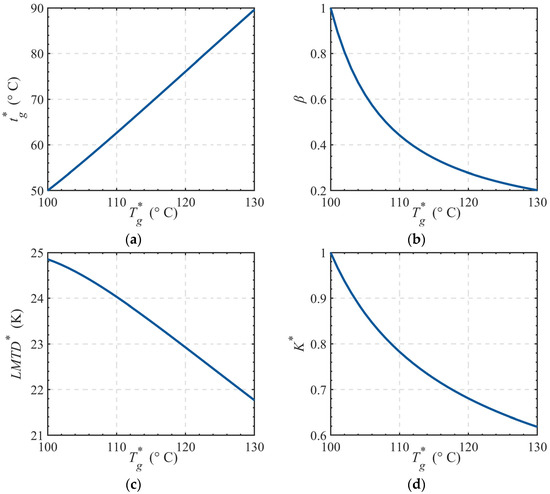 The heat output temperature, heat flow ratio, relative heat transfer coefficient, and adjusted logarithmic mean temperature difference (LMTD), calculated using Equations (1) and (3), vary with the primary network heating temperature as shown in Figure 3.