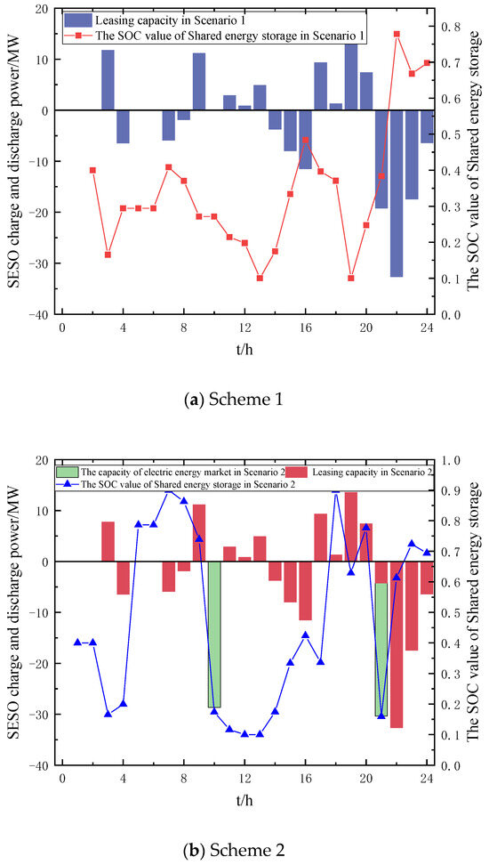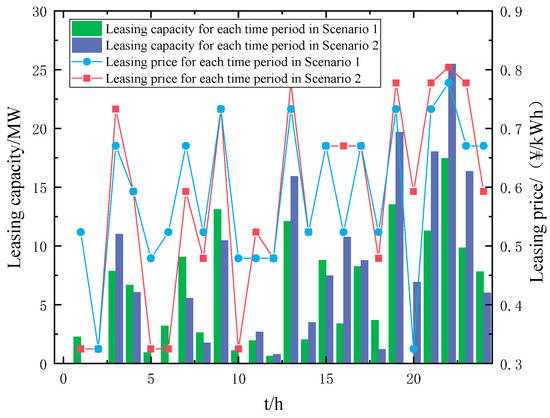 To analyze the impact of the uncertainty of wind power output on SESO’s leasing prices in different time periods during the day-ahead stage, two scenarios were set up for comparative analysis. Scenario 1: Using the method described in reference [19], the leasing results formed by the assessment cost without considering the prediction error caused by wind power uncertainty in the day-ahead stage. Scenario 2: The method proposed in this paper uses the probability distribution of prediction errors to determine the leasing results formed by the prediction error of wind power output, with a confidence level of 95%. The leasing capacity and leading prices of SESO in different scenarios are shown in Figure 3, and the leasing prices of capacity and mileage in each time period are shown in Appendix A, Table A3.