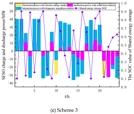 From Figure 5, it may be observed that with the diversification of application scenarios, the charging and discharging power of shared energy storage and SOC change frequency gradually increase. For Scheme 1, only the WFCO capacity lease scenario was considered, and the charging and discharging power of shared energy storage was centered around the leasing demand of WFCO in various time periods. The SOC value curve did not fluctuate significantly, and it fluctuated repeatedly below 0.5 during the 1–21 time periods. For Scheme 2, based on Scheme 1, the remaining capacity will be invested in the electric energy market, and the charging and discharging power of shared energy storage will peak during the highest electric price period in the electric energy market. For example, in periods 10 and 21, the discharging power of shared energy storage in the electric energy market is close to 30 MW; In the non-electric energy market, during the peak electric price period, the charging and discharging action of shared energy storage are more commonly used for WFCO capacity lease scenarios, thereby improving the overall utilization rate and economic revenue of SESO. For Scheme 2, the SOC values exhibit peak valley characteristics similar to those in the electric energy market, and the frequency of occurrence of SOC upper and lower limits is much higher than that in Scheme 1. For Scheme 3, introducing the frequency regulation market into the application scenario of shared energy storage, its charging and discharging action are more frequent compared to Scheme 2 and Scheme 1, and the charging and discharging power in each time period is closer to the upper and lower limits of rechargeable and dischargeable power, significantly improving the utilization rate of shared energy storage in each time period. Moreover, the number and magnitude of changes in the SOC value curve between the upper and lower limits of SOC have significantly increased, which indirectly confirms that the application scenarios of the frequency regulation market are conducive to significantly improving the operating power of shared energy storage in various time periods. Analysis shows that the frequency regulation market is an important scenario for reducing idle rates through shared energy storage. Rich application scenarios can effectively leverage the diverse value of shared energy storage and improve operational revenue.