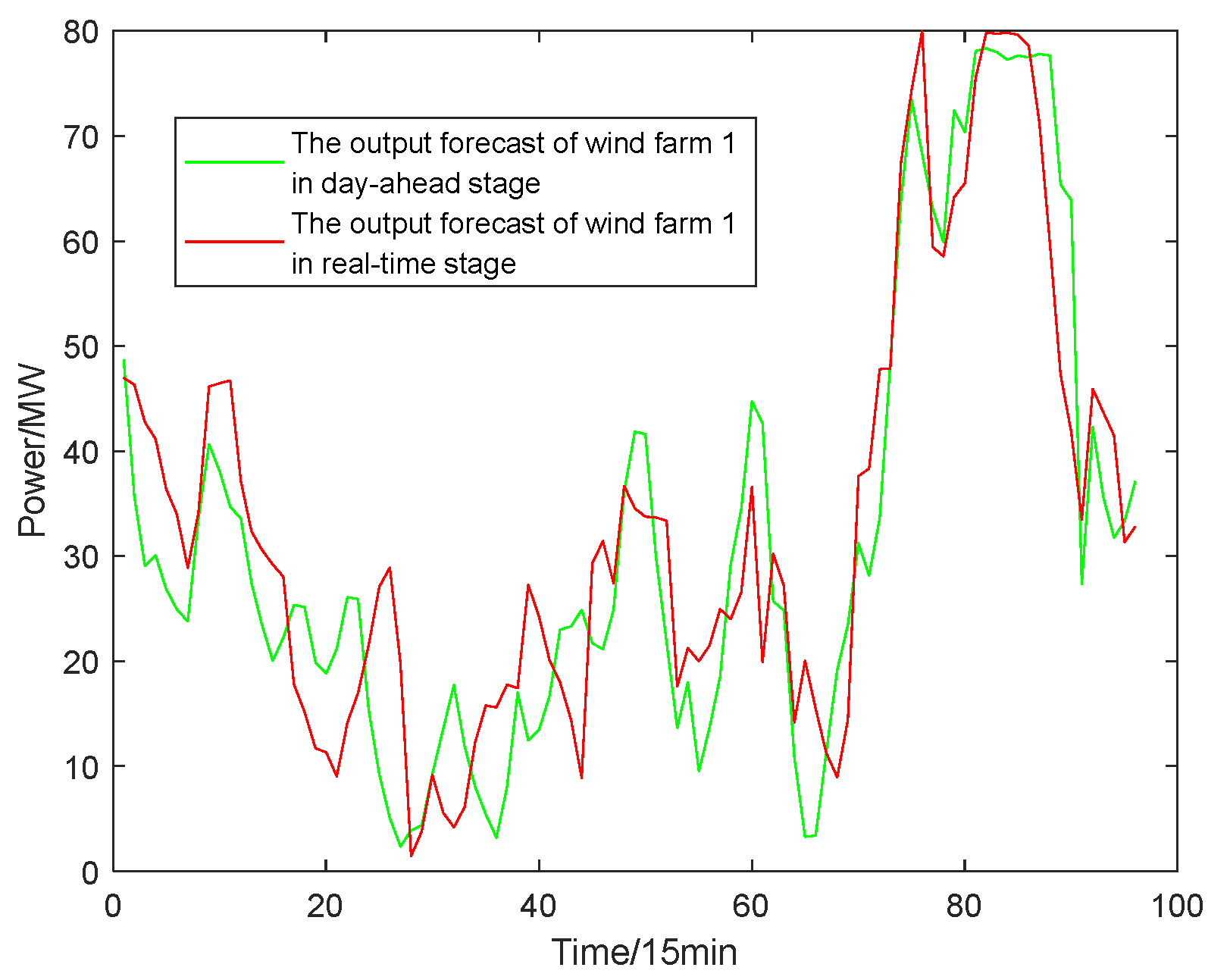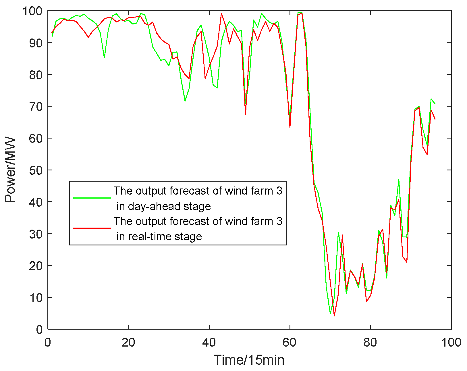The installed capacities of wind farms 1–3 are 80 MW, 85 MW, and 100 MW, respectively. The unit assessment cost caused by grid connected power fluctuations is 0.3654 CNY/kWh, and the unit assessment cost caused by prediction power deviation is 0.1250 CNY/kWh [19].