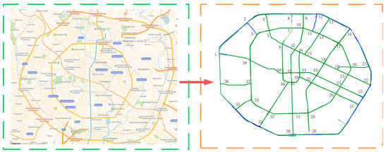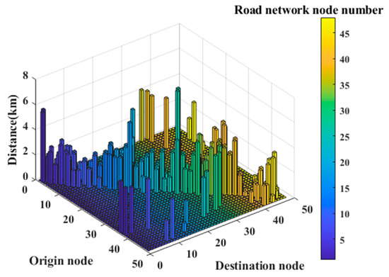 Connecting the MESS to the grid at the right time and location can effectively reduce the grid losses and total voltage deviation; therefore, during the scheduling process, the MESS needs to move between the road network nodes within a specified period of time to ensure that it is connected to the grid nodes at the right time. In addition, reducing the traveling distance also helps to reduce the traveling cost of the MESS. Consequently, in order to reduce the traveling distance and time of the MESS, it is necessary to plan the traveling path of the MESS.