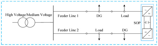 This study employs a back-to-back voltage source converter (VSC)-based SOP. In distribution networks, SOPs are installed between adjacent feeders to replace traditional contact switches, as depicted in Figure 2.
