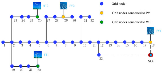 The topology of the grid is shown in Figure 3, where an IEEE 33-node network is used, with the wind turbines (WTs) located at nodes 22 and 26, the PV at nodes 18 and 29, and the SOPs connected between nodes 18 and 33.