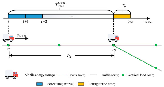 As Figure 4 shows the spatial–temporal scheduling model of MESSs. In the figure, and are denoting the starting and ending points of the MESS traveling, is the traveling speed of the MESS, and is the total weight. The weights here are equivalent to the distance of the MESS traveling the road during the dispatch process. During the MESS scheduling process, the timely deployment of the MESS can be affected by various traffic conditions, such as road congestion and signal delays at the road network nodes. Given that driving conditions are generally favorable under normal conditions, the MESS usually avoids frequent node transitions to save costs. Therefore, to simplify the model, this paper only considers the road distance and uses Dijkstra’s algorithm to optimize the driving path of the MESS to reduce the driving time and distance of the MESS in order to ensure the timely deployment of the MESS.