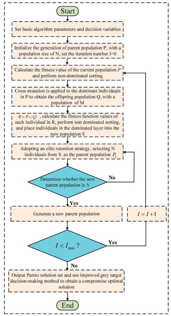 In this study, the decision variables of the optimization problem include continuous variables (e.g., the charging and discharging power of the MESS and the active and reactive power outputs of the SOP) and integer variables (the access node location of the MESS). There are nonlinear terms in the objective function (e.g., the minimization of total voltage deviation) and some constraints (e.g., power balance constraints, voltage–current constraints, etc.), and, since the optimization problem contains both continuous and integer decision variables, the problem belongs to Mixed-Integer Nonlinear Programming (MINLP). The solution of this problem is difficult to solve by traditional single-objective optimization algorithms and mathematical programming methods and usually requires the use of special optimization algorithms, such as NSGA-III (available via github) [35], which, as a multi-objective heuristic algorithm, has the advantages of strong optimization ability and fast convergence speed and is usually used for solving complex nonlinear problems. Therefore, NSGA-III is adopted in this paper to solve the MESS optimized scheduling model. In addition, the solution process of NSGA-III is shown in Figure 5.