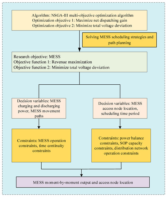 Figure 6 presents a comprehensive optimization framework aimed at optimizing the dispatch strategy and path planning of an MESS by applying the NSGA-III multi-objective optimization algorithm. The framework has two core objectives: maximizing the net dispatch gain and minimizing the total voltage deviation, which together guide the optimization process.