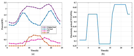Power system operation and TOU electricity price data: (a) original load, net load, WT, and PV outputs; and (b) TOU electricity price data.