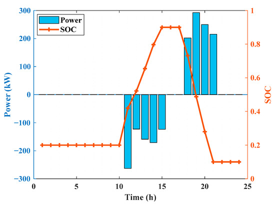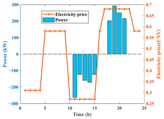 Figure 9 shows the TOU, as well as the power variation, of the MESS at different time periods. From the figure, it can be seen that when the TOU tariff is at a low level, the MESS starts the charging mode to actively store power, while, when the tariff rises to a high level, the MESS switches to the discharging mode to release the stored power. This flexible charging and discharging strategy enables the MESS to effectively utilize electricity price fluctuations for arbitrage, thereby reducing the overall cost of the electricity and improving energy utilization efficiency.