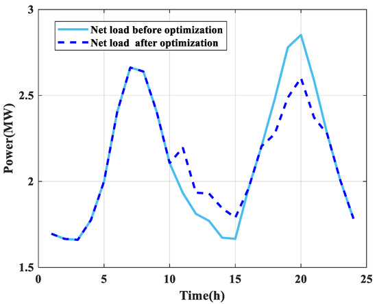 The net load curves before and after the MESS and SOP scheduling are shown in Figure 10, which shows that the fluctuation of the net load curves is significantly reduced after adding the MESS and SOP optimized scheduling, and the peak-to-valley difference is reduced from 1.191 MW to 0.941 MW, which is a decrease of 20.1%. It shows that compared to the case without access to the MESS and SOP, access to the MESS and SOP can effectively reduce the peak-to-valley difference of the grid, smooth the net load curve, and improve the stability of the grid.