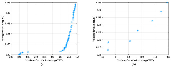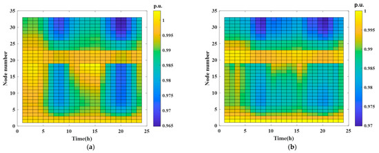 As shown in Figure 14, after the grid is connected to the MESS and SOP, the minimum value of the voltage is significantly improved, while the maximum value is decreased. This change makes the voltage distribution of the whole system become more centralized and effectively reduces the voltage fluctuation range. Specifically, the total voltage deviation of the grid was significantly reduced from 0.1999 p.u. to 0.0941 p.u., a reduction of 52.9%. This significant improvement not only optimizes the voltage quality but also enhances the stability of the grid and reduces the potential risks associated with voltage fluctuations. Combined with the data in Table 2, it can be seen that the synergistic scheduling of the mobile energy storage system and the soft switching points can effectively ensure the stable operation of the power grid while realizing significant economic benefits. This collaborative optimization strategy plays a key role in improving the efficiency and economy of the grid operation and provides strong support for the efficient operation of modern distribution grids. In addition, this strategy also provides more reliable grid support for the access of high-penetration distributed energy sources, which further promotes the wide application of renewable energy.