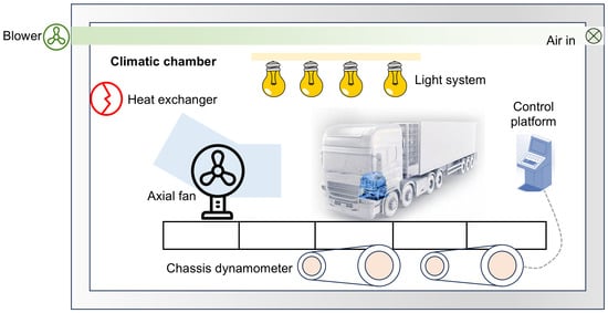 The present experiment employed a 49-ton heavy-duty commercial vehicle powered by an 115 kW fuel cell system and two 105 Ah auxiliary power batteries. Detailed specifications are presented in Table 1. To investigate the waste heat utilization and energy flow of fuel cells under low-temperature operating conditions, this experiment was conducted using a chassis dynamometer within an enclosed environmental chamber. The corresponding experimental setup is shown in Figure 1. The environmental chamber was employed to simulate real-world driving conditions, including solar radiation intensity, wind speed, ambient temperature, atmospheric pressure, and humidity. Additionally, the test system was equipped with a chassis dynamometer, which primarily consisted of rollers and a loading device composed of an eddy current machine. Its function was to simulate the driving road condition for the fuel cell vehicle. The wheels of the tested fuel cell vehicle could rotate on the rollers, while the loading device could adjust the rotational inertia of the eddy current machine as needed, thereby simulating various road resistances encountered under different conditions, such as hill climbing, acceleration, and coasting.