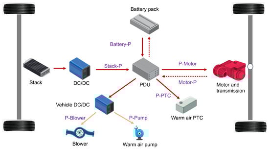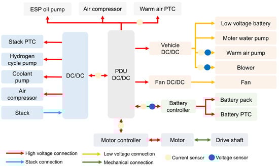 Figure 2 presents the electrical topology of the fuel cell-powered commercial vehicle used in this test. The stack was connected to the vehicle’s power distribution unit (PDU) via a boost DC/DC converter, supplying power either to the traction motor or charging the battery, with the power allocation determined by the energy management strategy. The auxiliary high-voltage output from the DC/DC converter of the fuel cell system powered components such as the PTC, hydrogen recirculation pump, and air compressor. During the fuel cell system startup phase, these auxiliary components relied on the battery to establish the necessary reaction conditions for the stack. Additionally, besides providing power to high-voltage components such as the air conditioning compressor and warm air PTC, the PDU also supplied power to the cooling fan, blower, water pump, and low-voltage battery through a buck DC/DC converter. The vehicle propulsion was entirely driven by the electric motor, and regenerative braking energy was recovered to charge the battery. To enable more precise energy consumption analysis, additional voltage and current sensors were installed at specific electrical interfaces.