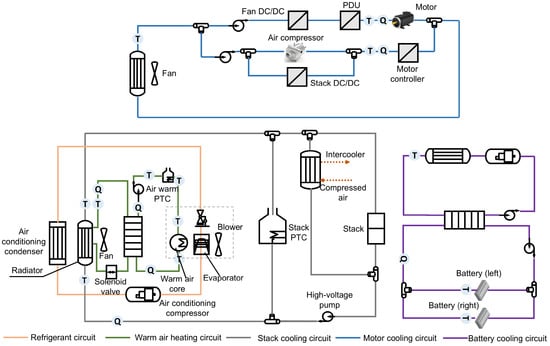 - Zhu, Z.; Wang, X.; Jiang, W.; Wang, W.; Li, C.; Li, S. A coupling and multi-mode thermal management system design and control for high-power fuel cell vehicles with utilizing waste heat. Energy Convers. Manag. 2025, 328, 119590. [Google Scholar] [CrossRef]