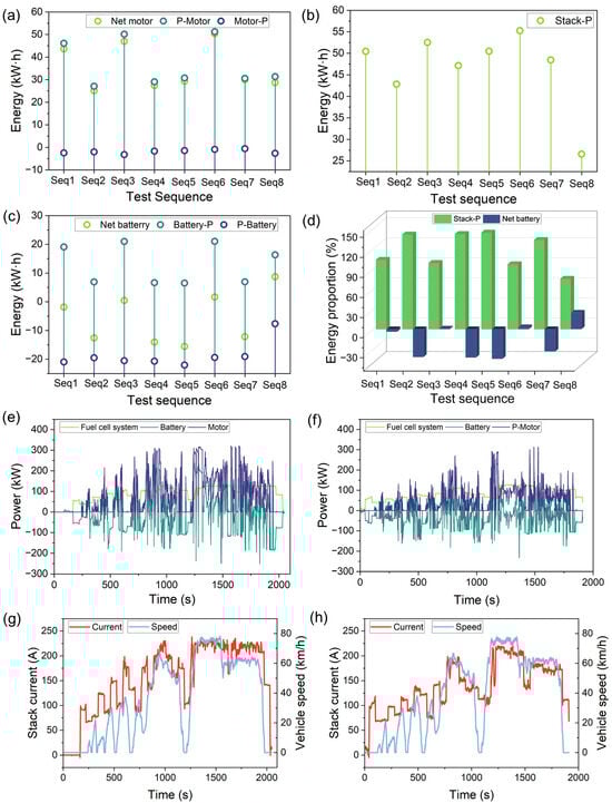 Energy consumption under different test conditions: (a) motor energy consumption, (b) fuel cell system energy consumption, and (c) battery pack energy consumption. (d) Statistical results of energy proportion under different test conditions. Power distribution and stack current versus vehicle speed at 7 °C under (e) full-load conditions and (f) corresponding stack current and vehicle speed variations and (g) half-load conditions and (h) corresponding stack current and vehicle speed variations.