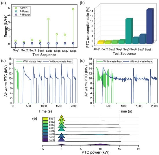 (a) Energy consumption of P-PTC, P-Pump, and P-Blower under different test conditions. (b) Ratio of warm air PTC energy consumption to total energy consumption. Power variation in warm air PTC with and without fuel cell waste heat utilization under half-load conditions at (c) −7 °C and (d) −25 °C, respectively. (e) Distribution of warm air PTC power under various testing conditions.