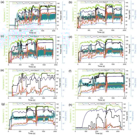 Stack-P, cooling circuit temperature and flow variations under different test conditions: (a) Seq1; (b) Seq2; (c) Seq3; (d) Seq4; (e) Seq5; (f) Seq6; (g) Seq7; (h) Seq8.