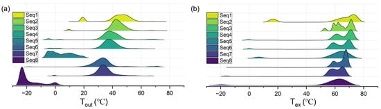 Figure 7 presents the fuel cell system output, cooling circuit temperature, and flow rate under various test conditions, where and denote the stack radiator inlet and outlet temperature, respectively; indicates the stack-side outlet temperature of the waste heat recovery heat exchanger. stands for the stack-side coolant flow rate in the waste heat recovery heat exchanger, and corresponds to the stack flow rate. The test results at 7 °C under both full-load and half-load conditions (Figure 7a,b) demonstrate that the coolant temperature at the stack radiator inlet was consistently maintained below 90 °C, though the average during half-load operation was slightly lower than that under full-load conditions due to reduced power output. During waste heat recovery operation, the coolant flow diverged into two parallel paths: one portion circulated through the stack radiator with forced convective cooling by fans, while the remaining portion entered the waste heat recovery heat exchanger branch to heat the cabin air-conditioning system coolant, resulting in a relatively low stabilized temperature range of 30–60 °C at the stack radiator outlet after flow recombination. The test results under °C conditions for full load, half load, and half load without waste heat recovery are shown in Figure 7c, Figure 7d, and Figure 7e respectively, with the radiator inlet temperature consistently maintained below 90 °C, demonstrating that the thermal management strategy effectively prevented system overheating. Comparative analysis of Figure 7d,e reveals that when the waste heat utilization shut-off valve was closed, the stack-side coolant flow rate in the heat exchanger branch dropped to zero. Hence, the outlet water temperature of the stack-side heat exchanger was less influenced by heat transfer from the stack cooling circuit, resulting in a gradual temperature increase from 7 °C to 59 °C over approximately 166 s, followed by periodic fluctuations between 56 °C and 73 °C upon stabilization. This fluctuation correlated with the warm air heating circuit temperature variation, primarily attributed to the intermittent operation of the warm air PTC. In contrast, waste heat recovery activation significantly enhanced thermal interaction between and the stack cooling circuit, yielding a faster temperature increase from 7 °C to 59 °C in about 99 s, and its variation trend aligned closely with that of the radiator inlet temperature . Furthermore, after the waste heat recovery function was deactivated, the heat from the waste heat exchanger branch and the warm air circuit could not be effectively transferred to the stack radiator outlet. The radiator outlet temperature remained relatively low throughout the testing process, not exceeding 20 °C, and the rate of temperature increase was slow. Specifically, it took approximately 103 s for the temperature to rise from the initial °C to the first peak of °C. On the other side, when waste heat recovery was enabled, the stabilized could be maintained above 30 °C, and the time required to increase from °C to °C was reduced to approximately 67 s. With this, the deactivation of waste heat recovery led to an excessively low outlet temperature in the fuel cell stack radiator, which could result in a low coolant temperature at the stack inlet; a such phenomenon increased the risk of flooding within the fuel cell stack and exacerbated the temperature differential between the inlet and outlet. These results indicate that activating waste heat recovery not only decreased the proportion of energy consumption attributed to the warm air PTC but also contributed to superior fuel cell thermal management. Consistent conclusions were drawn from the results shown in Figure 7f–h, which show that the radiator inlet temperature remained effectively controlled within the optimal range, while the radiator outlet temperature under deactivated waste heat recovery (Figure 7h) was markedly lower than measurement taken during active waste heat recovery operation. Figure 8 presents the statistical distribution of and during the testing process under different test sequences. It can be more clearly observed that with the heat recovery system activated, both the radiator outlet temperature and heat exchanger outlet temperature demonstrated significantly higher values.