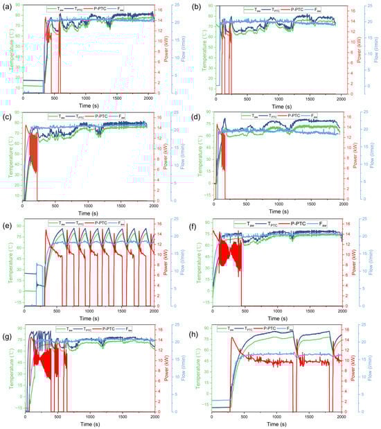 Outlet temperature of warm air PTC, warm air core, PTC power, and flow rate of warm air pump under different test conditions: (a) Seq1; (b) Seq2; (c) Seq3; (d) Seq4; (e) Seq5; (f) Seq6; (g) Seq7; (h) Seq8.