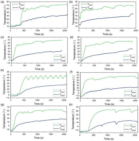 The measured cabin temperature profiles under different test conditions are presented in Figure 10, where represents the air outlet temperature at the driver’s foot vent (closely correlated with the warm air core temperature) and denotes the actual footwell temperature at the driver position. The results clearly demonstrate an inverse relationship between ambient temperature and cabin temperature. As can be seen, could only reach approximately 20 °C at the °C ambient temperature, whereas at the 7 °C ambient temperature, the climate control system maintained above 40 °C. It should be noted that the current ventilation and air conditioning system was operated in manual (open-loop) control mode with fixed airflow rates corresponding to predetermined target temperatures. Future implementation of automatic temperature control with closed-loop feedback regulation could potentially optimize thermal comfort while reducing overall vehicle energy consumption through more sophisticated control algorithms.