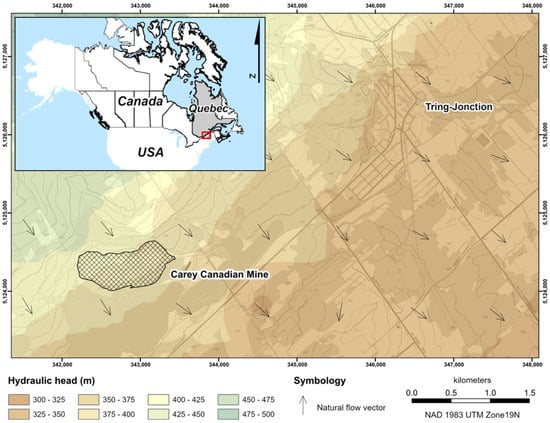 The direction of groundwater flow for the Tring-Jonction area was estimated using the Government of Canada terrain elevation models and data from “Système d’Information Hydrogéologique” (SIH), compiled over a 10 km radius around the Carey Canadian mine site. According to a linear interpolation carried out with 287 hydraulic head data, the local topography favours preferential flow in a southeast direction (Figure 1). Additionally, the direction of groundwater flow at the Carey Canadian mine site was estimated using water-level measurements taken in observation wells embedded in the till deposits []. Thus, the piezometry of the sector confirms groundwater flow oriented towards the southeast with an average hydraulic gradient of 0.037.