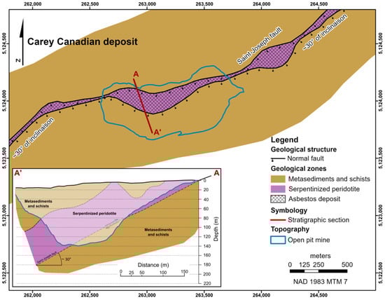 Bedrock geology of the Carey Canadian mine (adapted from Riordon [] and Lacombe et al. [].