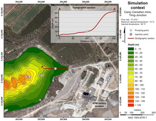 Société Asbestos Limitée, in Thetford Mines (Quebec, Canada), seeks to repurpose mine sites for geothermal energy. Lacombe et al. [] initially proposed an analytical approach to estimate geothermal resources in the region’s open-pit lakes, considering energy contributions from host rock and the watershed supply, varying the order of magnitude of key parameters to better quantify their influence on the resource. While useful for a first-order assessment, this analytical resource quantification based on the volumetric method did not model pumping–injection interactions. Further numerical simulations were required to support the potential development of KSM Fertilizers’ plant planned at the mine site, which would require substantial cooling of chemical processes. KSM aims to assess the Carey Canadian mine’s geothermal potential and TSC risk before implementing a system [,]. This current study addressed this problem, with the objective of evaluating the impact of natural heat transfer mechanisms, including free and forced convection, on the performance of an open-loop geothermal cooling system that could be installed in a flooded open-pit mine, which is related to the TSC risk. This represents a significant challenge since surface and groundwater flow needs to be fully coupled with heat transfer in a numerical model that can simulate the geothermal system operations. The success criteria to reach the set goal were to report a model calibrated with short-term observations that can accurately predict the long-term operation of the system considering TSC between the pumping and injection points. The Carey Canadian mine thus provides a useful example to develop similar numerical models at other sites and complete advanced numerical simulations of pit lakes cooling potential. The model presented is a first of its kind for geothermal resource assessment at a flooded open-pit mine, and this manuscript offers key insights into site characterization, system design, and resource estimation, with direct water use for industrial cooling.