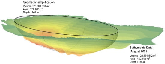 To meet the cooling needs of the industrial plant, KSM requires a continuous inlet temperature below 15 °C and a flow rate of 71 m3h−1. The reinjected water is estimated to reach a temperature of around 36 °C. The geometry of the model has been simplified to facilitate calculations, maintaining the total volume and maximum depth while representing its shape with a half-ellipsoid having a maximum depth of 140 m. Its surface area is estimated at approximately 250,000 m2, which corresponds to a volume of free water of approximately 23,000,000 m3 (Figure 4).