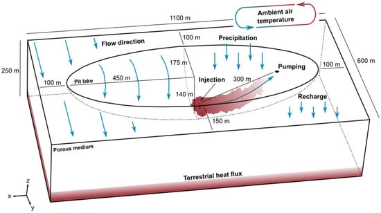 Typically, the geothermal potential of flooded open-pits depends on the thermal inertia of its water, which exchanges heat with the atmosphere, hydrosphere, and lithosphere []. Pit lakes act as rechargeable thermal batteries, influenced by solar radiation, evaporation, precipitation, wind, and groundwater interactions []. Ngoyo Mandemvo [] used numerical simulations to evaluate the geothermal potential of the abandoned King-Beaver mine (Quebec), incorporating pit geometry and rock-water thermal interactions but omitting groundwater flow dynamics and pumping effects. Understanding these interactions is key to minimizing TSC [] and advancing geothermal development in flooded open-pit mines.