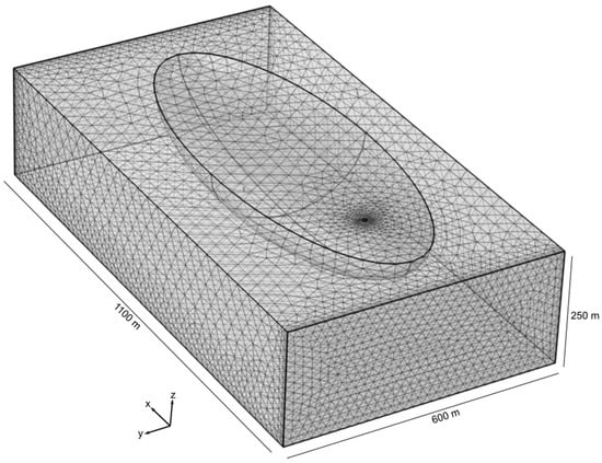 The model is composed of a total of 113,713 elements, constructed mainly of tetrahedral shapes, with maximum and minimum dimensions of 38.7 m and 3.8 m, respectively. The presented mesh is considered the most appropriate to represent the simulation context after numerous convergence tests and careful adjustment of the configuration of the elements. The overall quality of the mesh elements was assessed using the Skewness measurement integrated into the COMSOL Multiphysics software. This measurement makes it possible to evaluate the quality of the elements according to equiangular obliquity. The general principle is to penalize elements having angles that are either too large or too small compared to the angles of an ideal element []. Mesh quality is a dimensionless value between 0 and 1, where 1 represents a perfectly regular element and 0 represents a degenerate element that may cause convergence problems. In general, elements with quality below 0.1 are considered bad for many applications. The meshing algorithms in COMSOL Multiphysics software aim to avoid the creation of poor-quality elements, but depending on the complexity of the geometry, these algorithms do not always achieve the quality required to ensure convergence. It is therefore essential to check the minimum and average quality of the elements of the numerical model. The overall quality of the numerical model was optimized using a manual refinement of the mesh at the injection and pumping points. The elements of the numerical model have an average quality of 0.70 with a minimum quality of 0.11, which ensures convergence and stability in the numerical simulations.