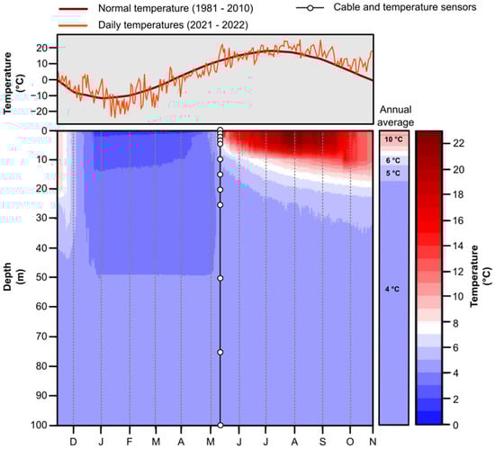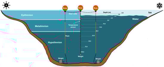 Conceptual model of thermal stratification within a flooded open-pit during the summer and winter periods and diagram of the installation allowing recording of the water temperature at different depths throughout the year (adapted from []).