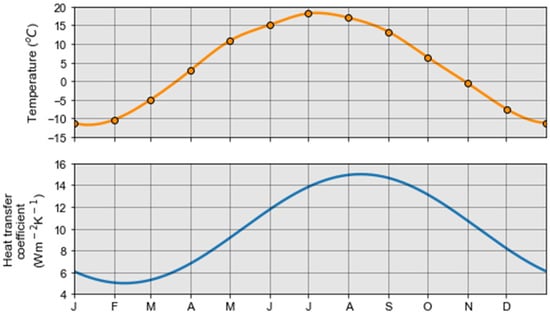Correlation between air temperature reported in climate normals from the Thetford Mines meteorological station [] and the sinusoidal function of the heat transfer coefficient.