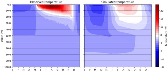 During the summer period, deep-water masses are characterized by depth-dependent temperature stratification caused by subsurface flow regimes and seasonal temperature variations [,]. Thermal stratification is characterized by three distinct zones differentiated by their contrast in temperature and density. The epilimnion generally represents the warmer surface zone and rests on a layer of cold water whose temperature is relatively undisturbed, namely, the hypolimnion. These two sections are separated by a thermal transition zone within which the temperature fluctuates greatly. The latter is known as the metalimnion [,,].