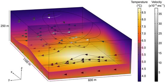 A steady state simulation was made afterward to determine flow and temperature conditions in the porous medium and the open water body before the operation of the geothermal system (Figure 11). As a result, the temperature at the surface of the pit lake remains stable at 4 °C and shows a slight increase with depth. The difference in hydrostatic pressure causes a movement of the flow vectors from the porous medium towards the open water, where the flow velocity is higher. Furthermore, the interaction between the incoming water and the water inputs imposed on the surface of the numerical model results in a slight downward trend in the flow lines along the y-axis.