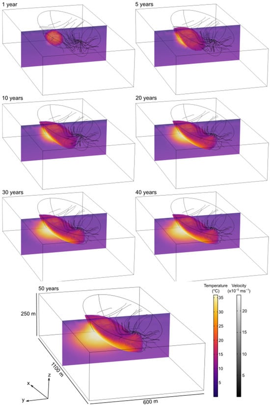 The effect of injection and pumping at the start of the simulation is shown in Figure 12. The interaction between injection and pumping is mainly concentrated in the first half of the pit lake. In the second half, the natural flow is preserved, and the temperature is not affected by the operation of the geothermal system. Many injection flow lines reach the pumping zone, but some of these flow lines pass through the porous medium. Some of the water entering the pit lake is captured by the pumping zone, causing the temperature of the sampled water to mix. As illustrated in Figure 12, thermal plume propagation is mainly influenced by flow lines related to injection and pumping.