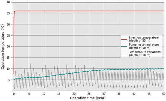 During the first 30 years of continuous operation, the thermal plume propagates and amplifies rapidly. However, between 30 and 50 years of operation, the expansion of the thermal plume inside the pit lake slows down considerably, reaching thermal equilibrium with the natural environment. The thermal plume propagates along the limit of the pit lake, between the injection zone and the pumping zone, and penetrates inside the porous medium over a maximum distance of approximately 100 m after 50 years of operation. Injection and pumping temperature data extracted from COMSOL Multiphysics software are shown in Figure 13.