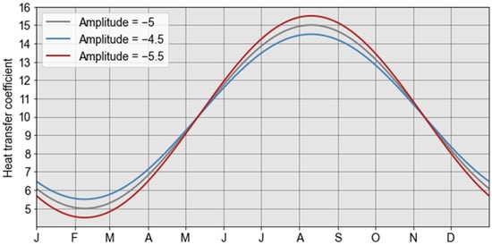 The heat transfer coefficient () integrated in Equation (12) was modelled as a sinusoidal function whose value varies as a function of time (; s) to effectively represent the effect of variations in ambient air temperature with the numerical simulations: