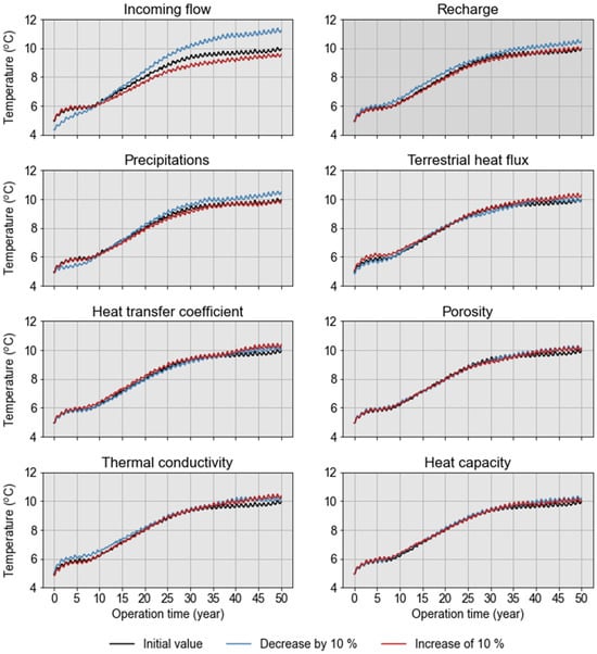 A variation of ±10% was chosen in the sensitivity analysis to maintain the stability of the numerical simulations, particularly when modifying parameters linked to water inputs such as precipitation, recharge, and inflow. When too large a variation was applied to these input parameters, it could disrupt the numerical stability and make the analysis inconclusive. Furthermore, as explained in Section 4.1, the surface heat transfer coefficient is represented by a sinusoidal function whose intensity depends mainly on the amplitude of this function. Thus, a variation of ±10% applied to the initial amplitude of −5 of the sinusoidal function in Equation (13) was considered in the sensitivity analysis (Figure 14).