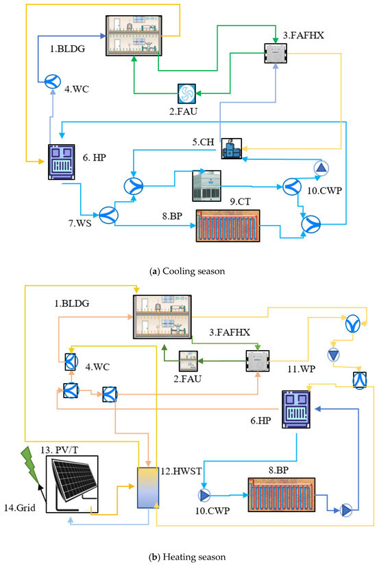 Figure 2. Schematic diagram of system operation. (a) Cooling season; (b) Heating season. Note: 1. BLDG: Building 2. FAU: Fresh air unit 3. FAFHX: Fresh air full heat exchanger 4. WC: Water collector 5. CH: Chiller 6. HP: Heat pump 7. WS: Water segregator 8. BP: Buried pipe 9. CT: Cooling tower 10. CWP: Cooling water pump 11.WP: Water pump 12. HWST: Hot water storage tank 13. PV/T: PV/T solar collector 14. Grid: Power grid.