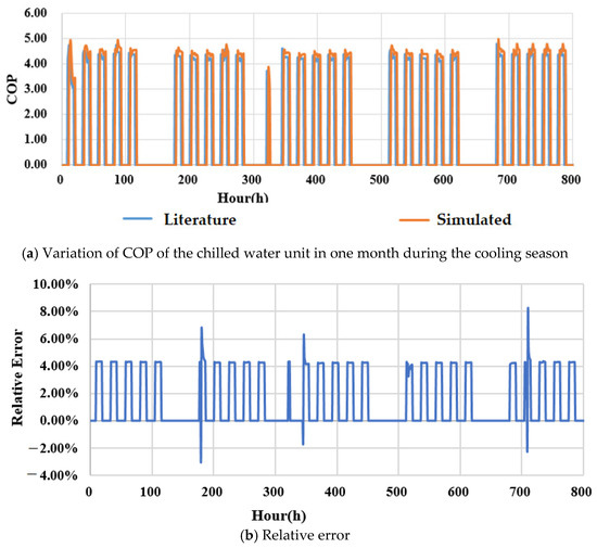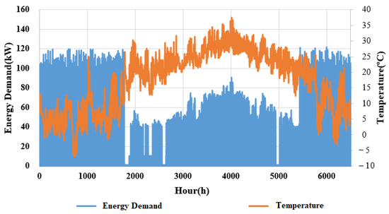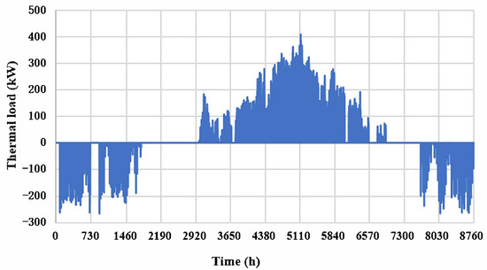 Chinese Standard Weather Data (CSWD), downloaded from the EnergyPlus official website [29], were used as climate inputs. According to [30], the occupancy density, minimum fresh air volume, lighting density, the equipment load density are 5 m2/person, 30 m3/h per person, 9 W/m2, and 15 W/m2, respectively. The cooling temperature setpoint and heating temperature setpoint are 26 °C and 18 °C, respectively. The hourly thermal load of the building, as calculated by DesignBuilder, is presented in Figure 3, with a maximum cooling and heating load of 442 kW and 278 kW, respectively.