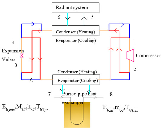 Figure 4 presents the system diagram of the ground source heat pump for exergy analysis. The blue color line refers to cooling operation and the red color line refers to heating operation. The state point approach is applied as it has been proved by other researchers [27,28] to be useful to calculate the energy consumption and exergy loss for each component. During the cooling season, cooling water enters the radiant system at point 5; after absorbing heat from the building, it reaches point 6 and then returns to the evaporator of the heat pump and cools down to point 5. The cooling water that absorbs heat in the condenser enters the buried pipe heat exchanger at point 7. After releasing heat to the soil, the water that changes to point 8 enters the condenser and circulates to absorb the heat released by the refrigerant and returns to point 7 [35].