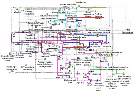 Figure 2 presents the system operation diagram. During the cooling season, the heat pump unit provides chilled water to cool the fresh air and the high-temperature chiller supplies chilled water to the radiant terminal to maintain space temperature at 26 °C. The chiller will be turned ON when the space cooling load is above 10% of the maximum value. The heat pump unit and fresh air unit are turned ON during the cooling season and maximum fresh air flow is allowed during the transition season for energy saving purposes; minimum fresh air flow is provided during non-economizer mode. During the heating season, the system is operated under three modes to ensure the returned hot water temperature is higher than 30 °C and maintain space temperature at 18 °C: (1) the solar collector system serves as the only heat source for the system; (2) the heat pump unit serves as the only heat source; and (3) the solar collector system and the heat pump unit jointly provide heating to the building. The PV/T system mainly serves as a heat source for domestic hot water and space heating, and is also connected to the public power grid. Due to limited roof surface area, the PV/T system can only meet 30% of the maximum heating load. The heat pump unit will be turned on when the heating load exceeds 10% of the maximum value, otherwise, hot water will be supplied from the hot water storage tank to the radiant system for radiant heating. Minimum fresh air flow is provided during heating season.