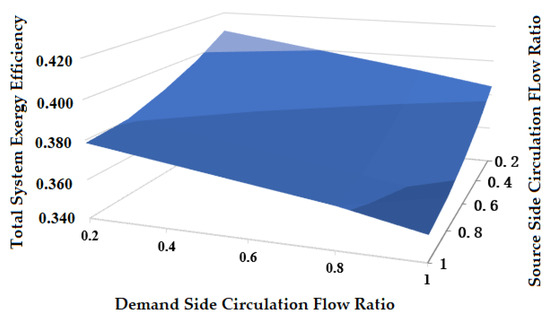 This paper presents energy and exergy studies on a photovoltaic-thermal solar-assisted geothermal heat pump coupled with a radiant ceiling system. The system utilizes renewable solar and geothermal energy. It has an independent fresh air unit that provides clean air to the space. The computer model of the system was developed under the TRNSYST environment and validated with experimental results from open literature. Distribution of the energy consumption and exergy loss of the system were analyzed. It was found that the heat pump unit consumes the largest amount of energy while the transmission and distribution system has the highest exergy loss. Under optimized operating conditions, i.e., both demand side circulation flow and source side circulation flow are maintained at 65% of the design flow rate (design loop water temperature difference of 7.0 °C), the average exergy efficiency of the whole system was found to be 37.56%, which achieves an accumulative exergy loss reduction of 16.5% compared with 100% design flow rate condition during cooling season. The optimal bearing load ratio of the ground source heat pump vs. photovoltaic-thermal system in the heating season was found to be 67%.