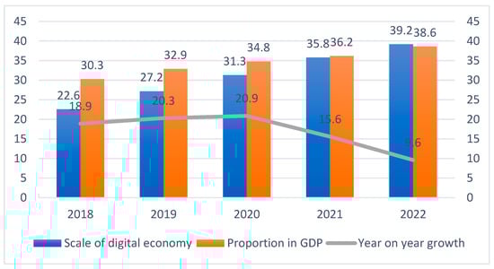 At the same time, the digital economy (DE) is becoming increasingly vital in driving global economic growth and reshaping international competitiveness [3]. Developed nations such as the United States, Japan, Germany, and the United Kingdom are actively promoting the development of DE, with its digital economic output contributing to roughly 50% of their GDP. Studies indicate that 22% of the global GDP is closely tied to sectors related to DE. Among these, the United States and China are leading in the scale of their digital economies. According to the DE White Paper (2023), China’s digital economy grew by 15.6% in 2022, nearly three times the country’s overall GDP growth rate for the year. DE has become a new engine for China’s economic development, offering vast prospects and significant growth potential [4]. Figure 1 shows the trend in the size of China’s DE from 2018 to 2022. The rising year-on-year growth from 2018 to 2020 suggests that the development of the digital economy has grown rapidly during this period. Thereafter, the DE enters a period of stable development, with its scale increasing and stabilizing gradually.