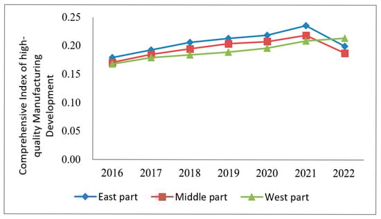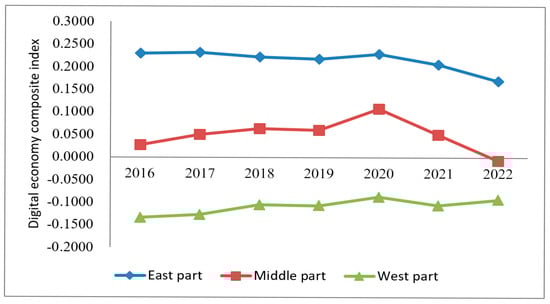 Figure 2 shows the comprehensive index of DE in three regions. As can be seen from Figure 2, during the investigation period, there were significant differences in the changing trend of the DE index in the three regions, among which the DE index in East China changed less, always higher than that in the central and western regions. The DE index in Central China has shown a downward trend, and it is lower than that in the western region in most years. The DE index in West China is characterized by slow climbing, and the development gap with the central region is widening. It demonstrates that during the period of 2016–2022, the development of DE presented the law of sequential decline in the eastern, western and central regions. On the one hand, this may be due to differences in digital infrastructure and technological accumulation. The eastern regions started building digital infrastructure earlier, with well-developed 5G networks, data centers and industrial internet, providing a solid foundation for the development of the digital economy. In contrast, the central and western regions face significant shortcomings in information network coverage and computing power distribution, which constrain the rapid growth of the digital economy. On the other hand, the eastern regions are dominated by high-end manufacturing and modern service industries, where enterprises have a strong willingness to undergo digital transformation and benefit from diverse technological application scenarios. The central regions have a high proportion of manufacturing, but the pace of digital transformation is relatively slow. Meanwhile, the western regions primarily rely on resource-based industries, with a lower penetration of the digital economy, making it difficult to achieve economies of scale.